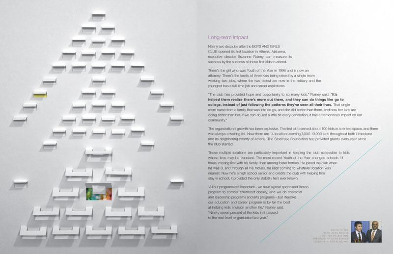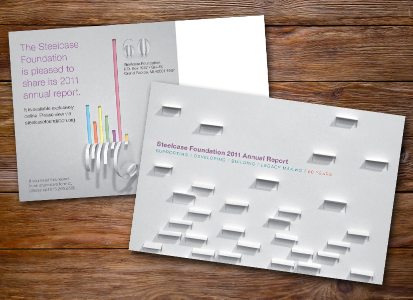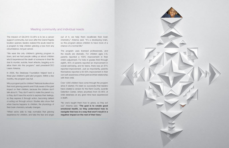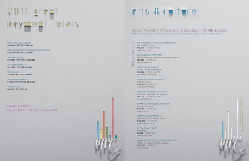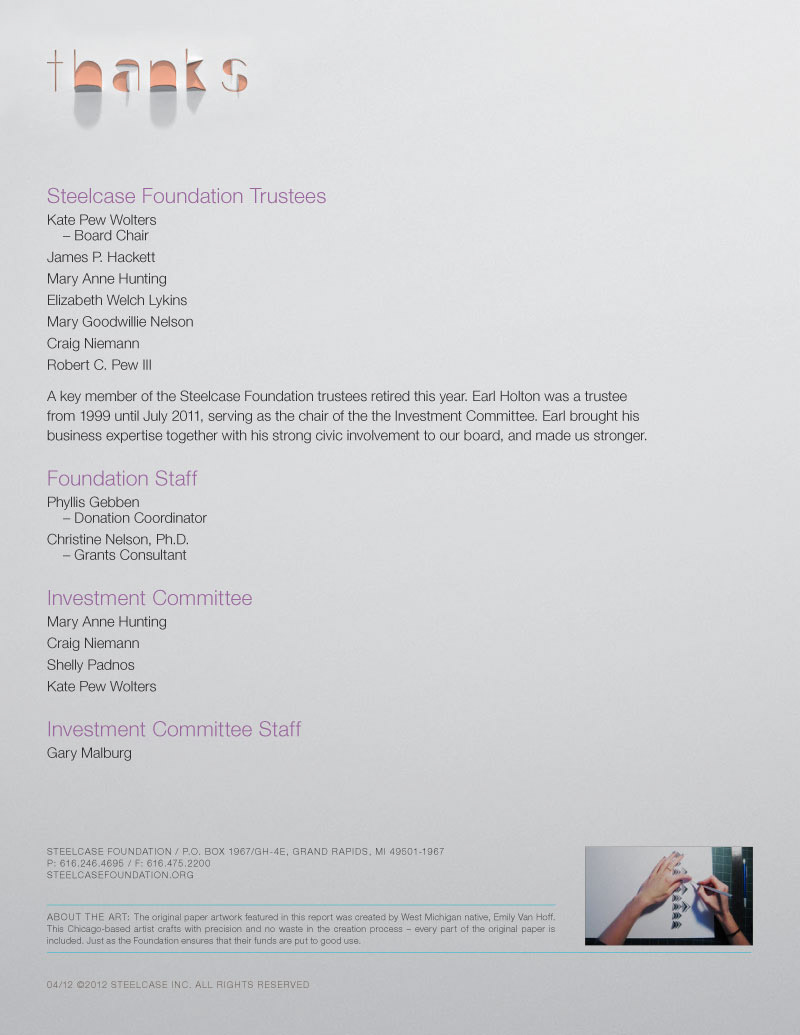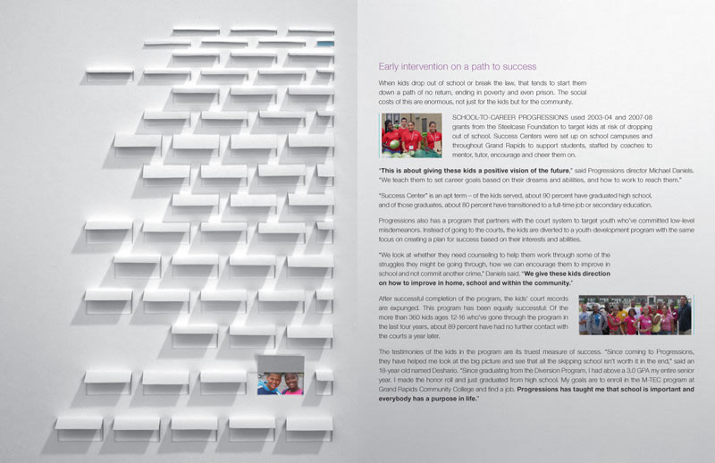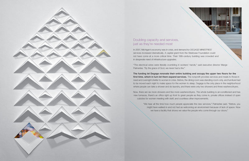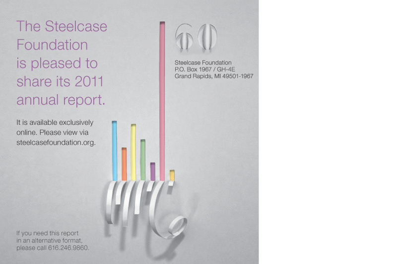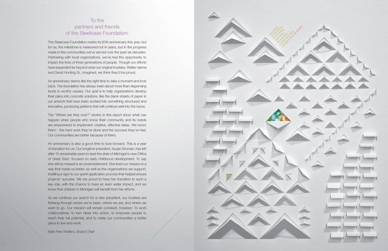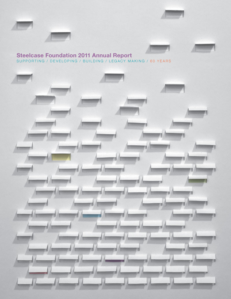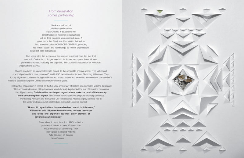 The concept for the 2011 annual report celebrates the 60 years that the Foundation has been helping organizations thrive. By utilizing unique custom cut paper art of Chicago artist Emily Van Hoff, the Foundation tells the stories of some of these organizations while suggesting that the legacy will continue to be built well into the future. Sherrie Wilson, writer. Emily Van Hoff, cut paper art. Rachel Hyde, concept, art direction and design.