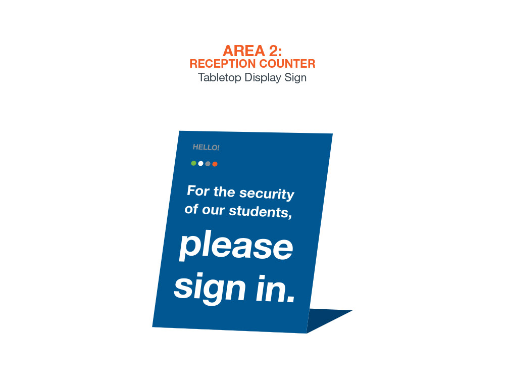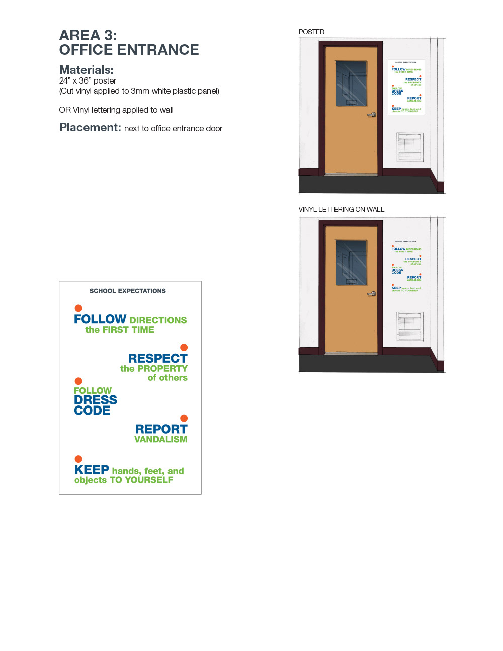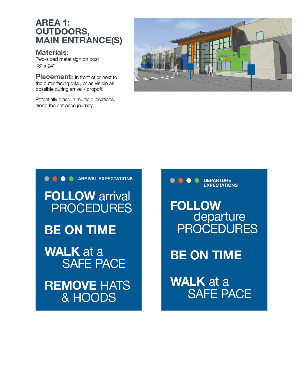 A series of large-scale posters strategically placed within school hallways. Designed to communicate behavior expectations to students while at school and express security expectations for parents. This signage helps support the important work of teachers and administrators.
