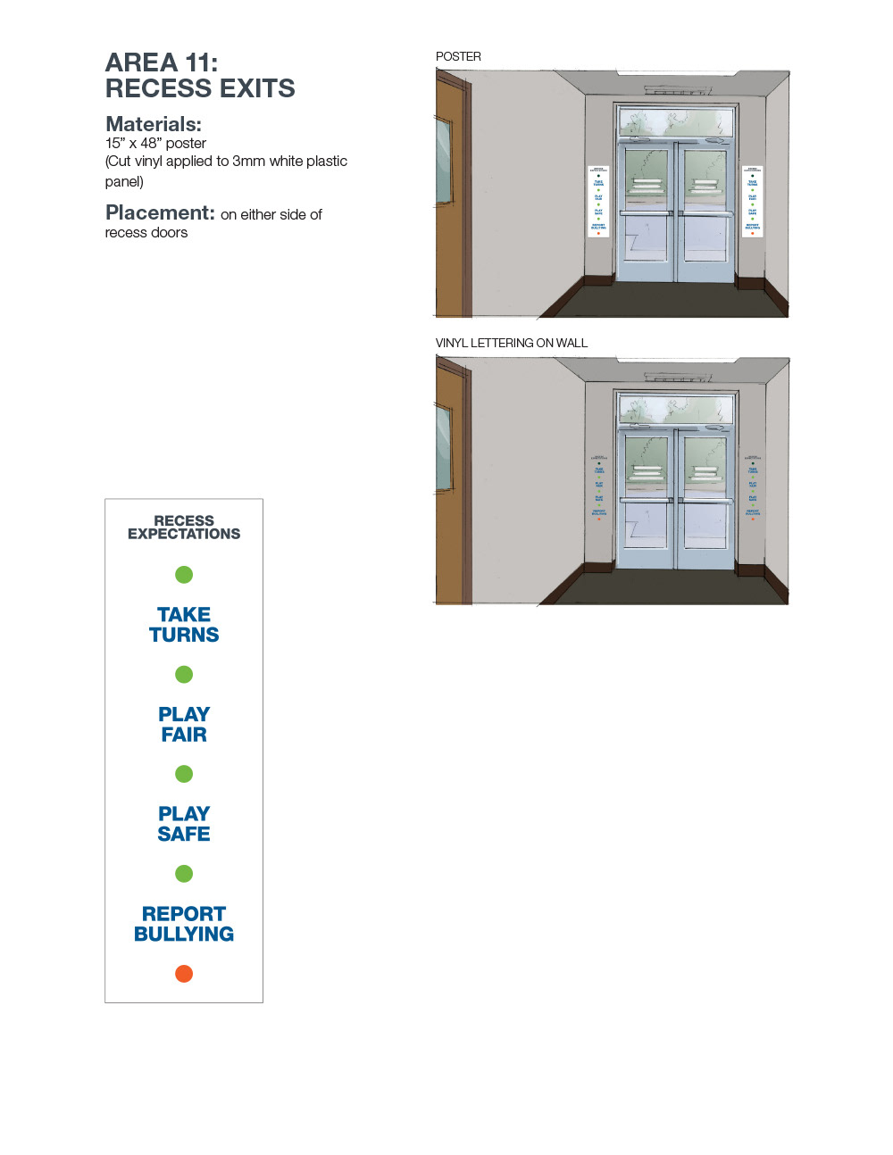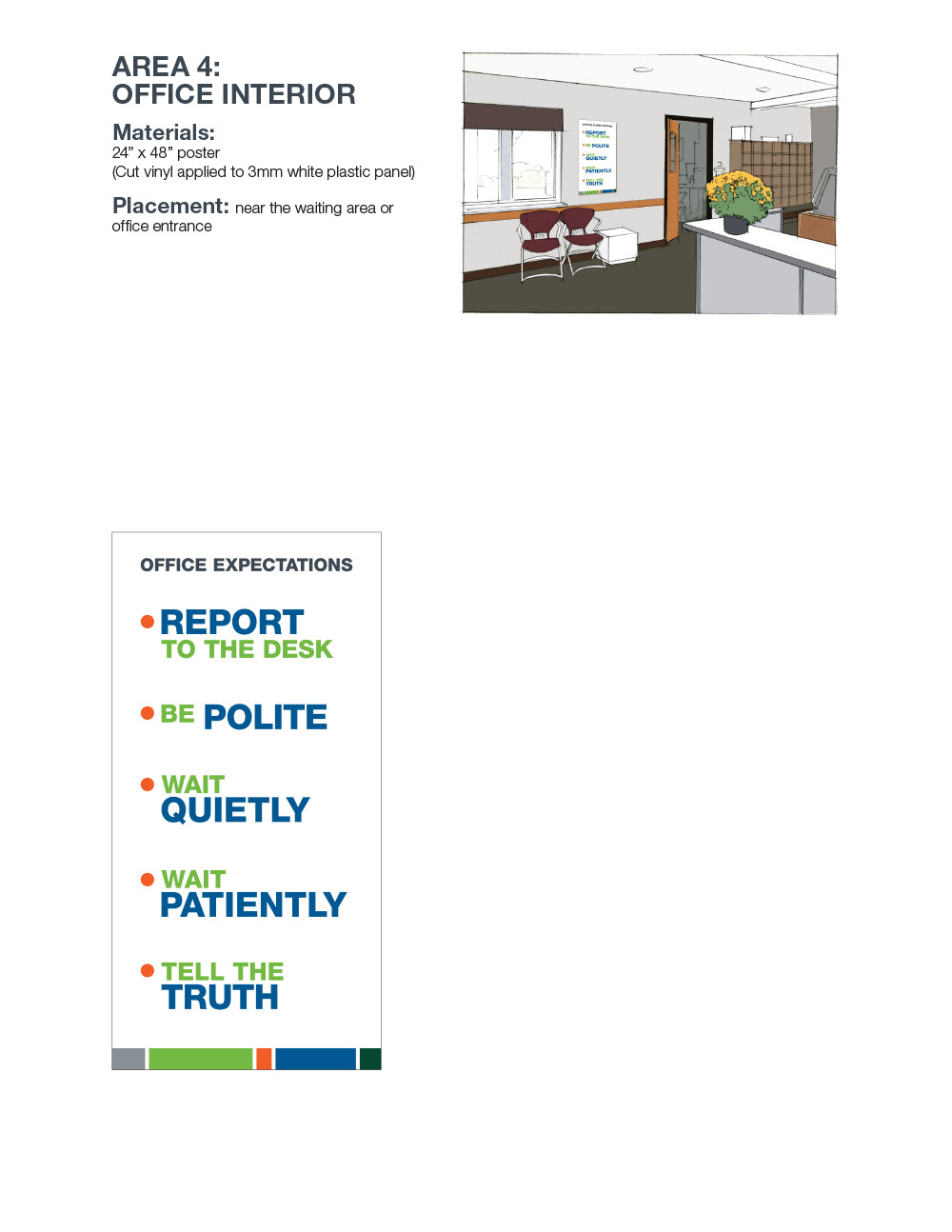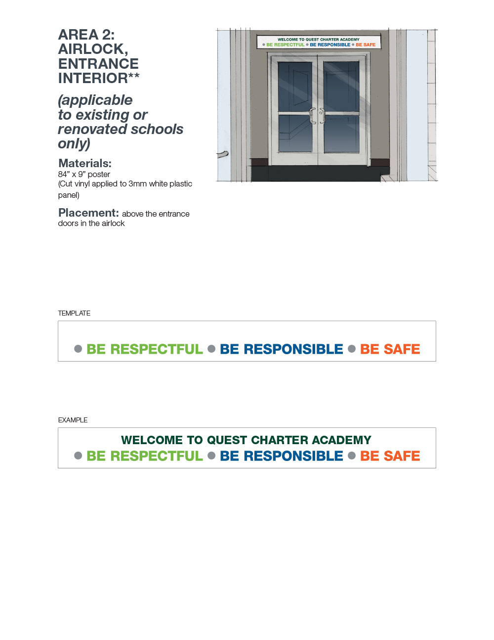 A series of large-scale posters strategically placed within school hallways. Designed to communicate behavior expectations to students while at school and express security expectations for parents. This signage helps support the important work of teachers and administrators.
