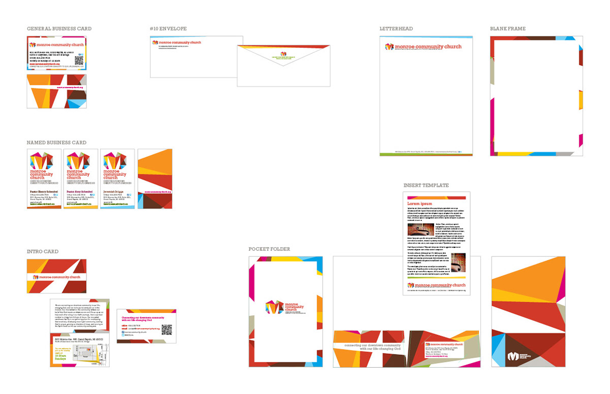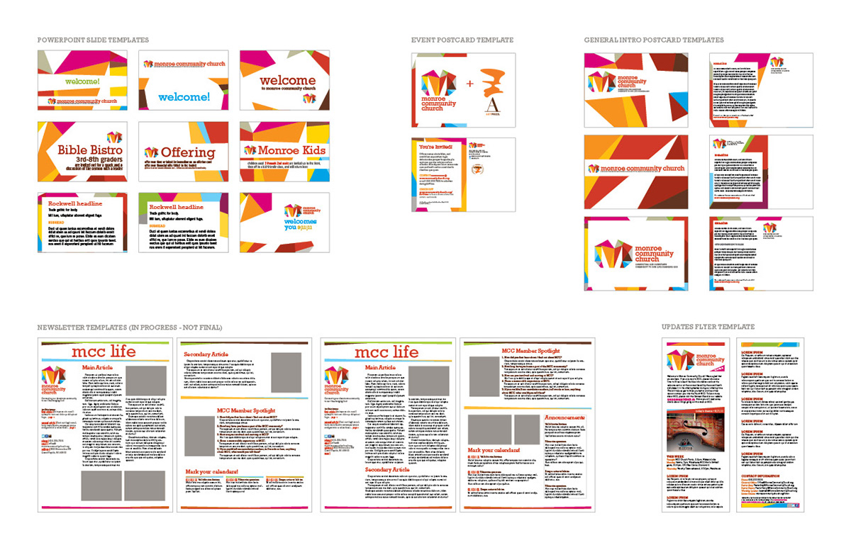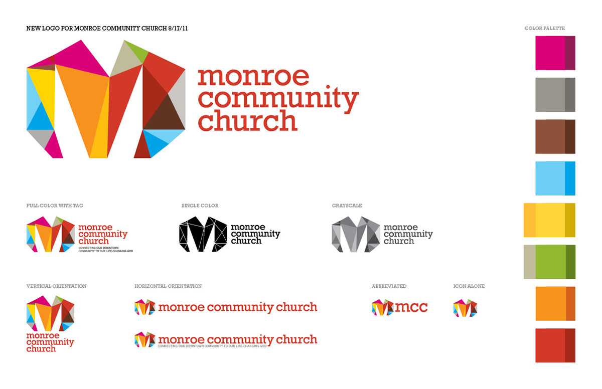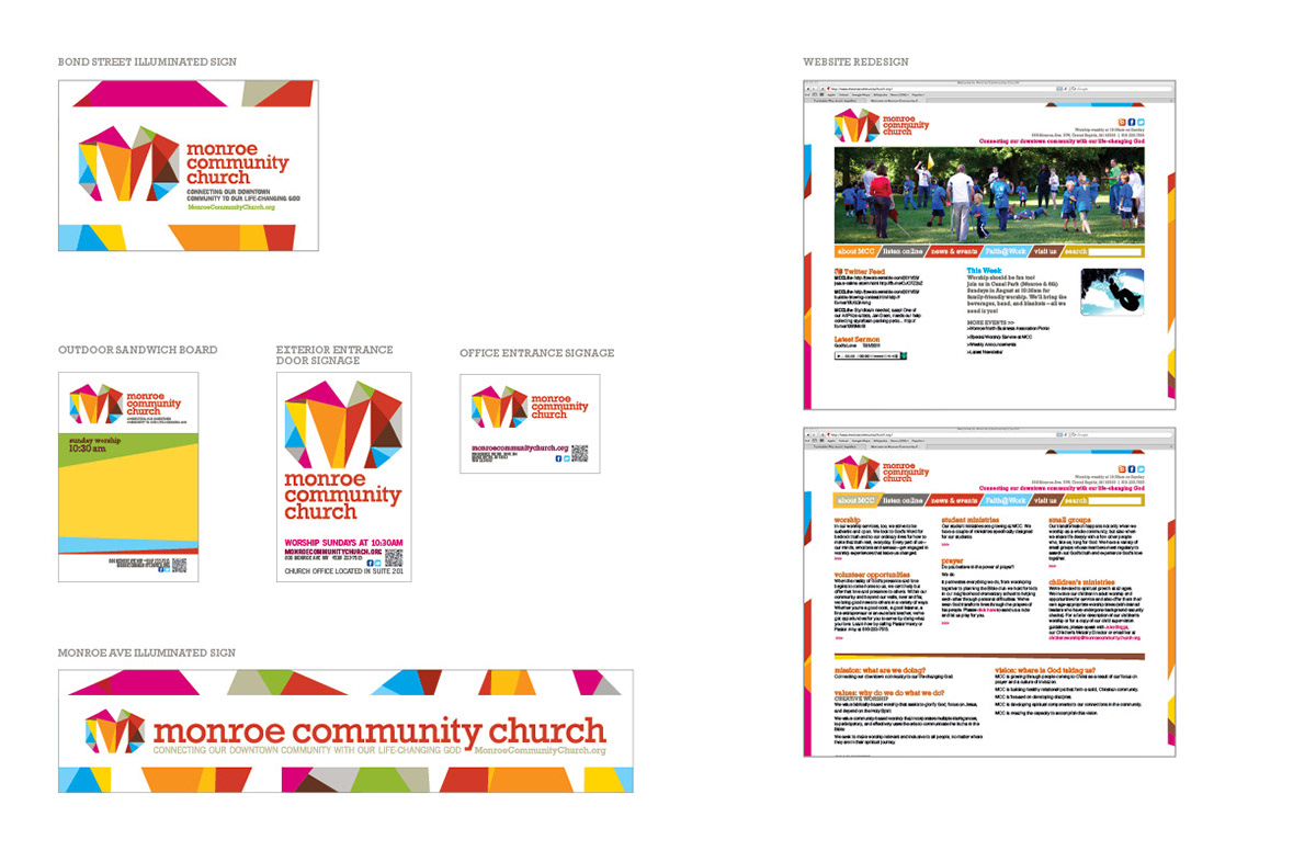 Monroe Community Church engaged Hyde Creative to come up with a consistent look for all of their communications. The launch of this new organized look would coincide with their stepping out as a newly independent church. The result is a new logo with fresh bold colors, and graphic elements that can easily be utilized across a broad range of communication needs. Special thanks to artist Damion Van Slyke of Detergent Design for the creation of the icon, and intern Koheun Lee for her work in generating the new look of the templates. • Logo and brand identity, including color, font, and graphic elements palette • Exterior signage • Promotional, event, & marketing materials; templates for client use • Website makeover