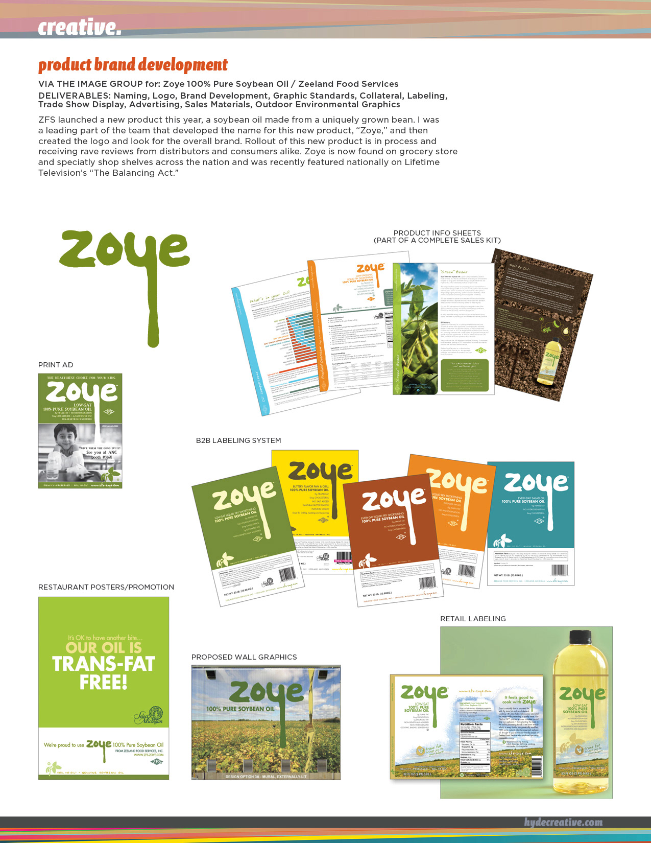 Zeeland Food Services launched a new product – a soybean oil made from a uniquely grown bean. I was a leading part of the team that developed the name for this new product, “Zoye,” and then created the logo and look for the overall brand. Rollout of this new product is in process and receiving rave reviews from distributors and consumers alike. Zoye is now found on grocery store and speciatly shop shelves across the nation and was recently featured nationally on Lifetime Television’s “The Balancing Act.”